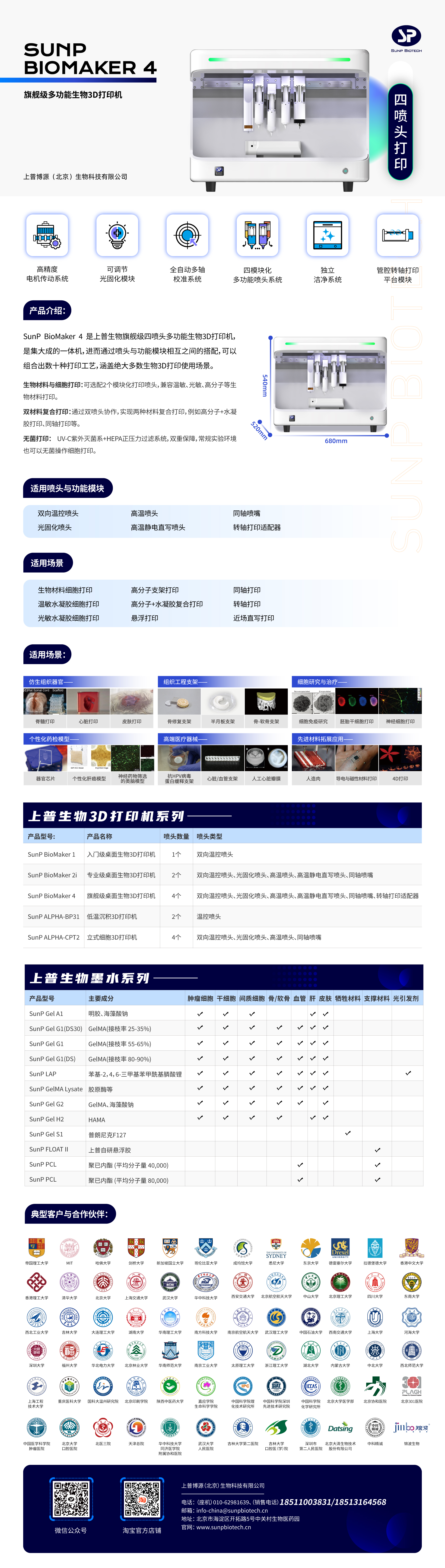 SunP BioMaker 4 是上普生物旗艦級四噴頭多功能生物3D打印機,是集大成的一體機,通過噴頭與功能模塊相互之間的搭配,可以組合出數十種打印工藝,涵蓋絕大多數生物3D打印使用場景。