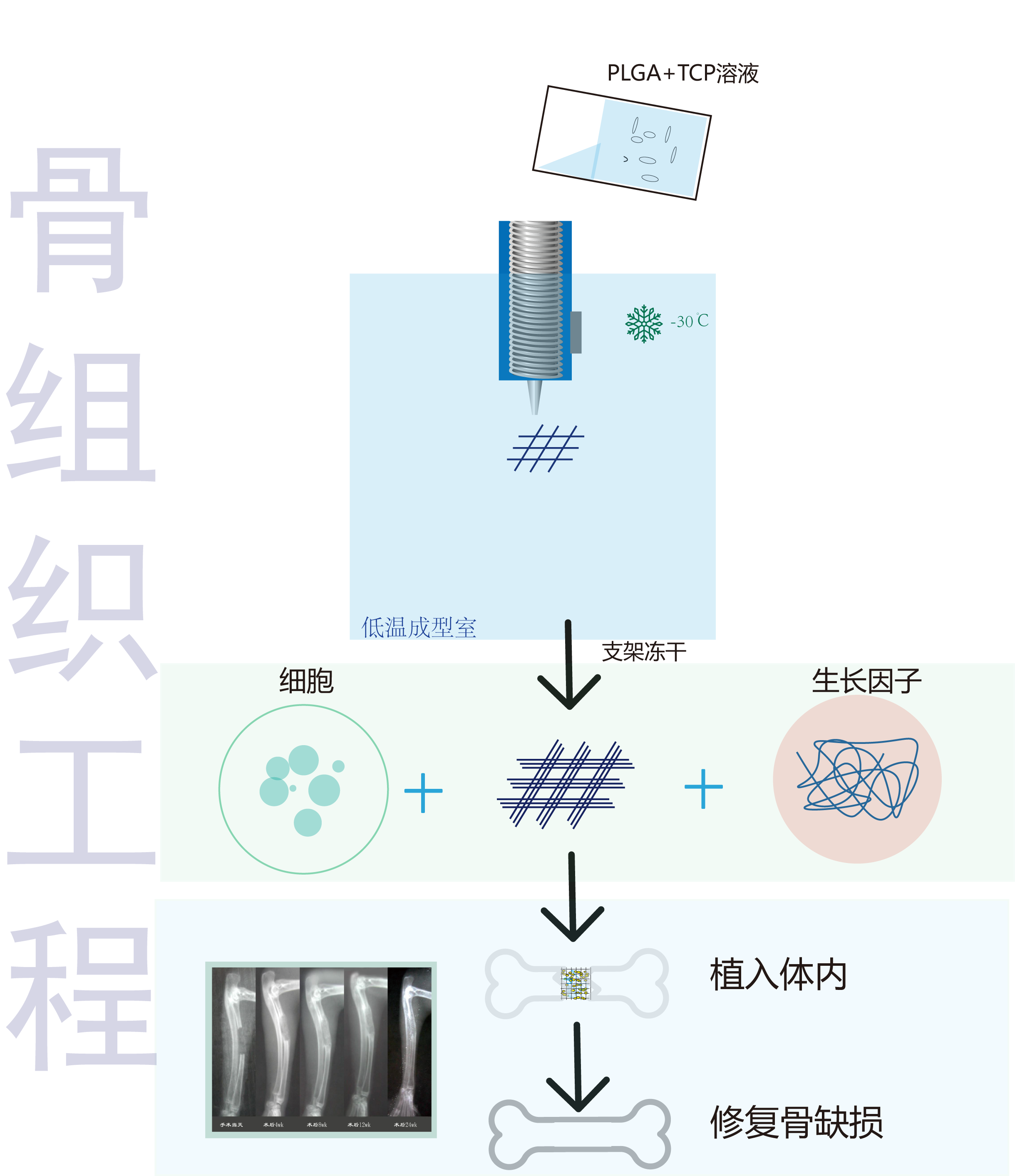 賴博士等 利用低溫沉積3D打印出PLGA/TCP/Mg體系的支架,宏觀空隙有450μm,微觀空隙在2.5-90μm之間,Mg的加入可以極大提高支架的力學性能,15%wt的Mg其力學強度可以達到104Mpa,而且保證良好的生物學性能可以促進并誘導細胞增殖分化成骨組織。