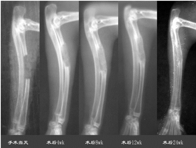 清華大學熊卓和第四軍醫(yī)大學利用PLLA/TCP復合材料,PLLA與TCP的質(zhì)量比為7:3,制造支架的開放孔隙的孔隙率為80%,大孔孔徑約為500 μm,微孔孔徑約為5 μm。支架的外形為直徑5mm、長15mm的圓柱形;生長因子為rhBMP-2。結(jié)果顯示術(shù)后4周,骨缺損區(qū)有不均勻的低密度骨痂顯影;術(shù)后8周,骨痂顯影密度增高,骨痂外層形成皮質(zhì)骨輪廓,與缺損斷端連接;術(shù)后12周,骨痂密度進一步增高,中心區(qū)出現(xiàn)與植入支架輪廓一致的高密度區(qū),周圍皮質(zhì)骨輪廓清晰,與斷端連接良好;術(shù)后24周,骨痂塑型完好,骨痂皮質(zhì)骨與缺損兩斷端的皮質(zhì)骨完全融合成一體,骨痂中心區(qū)密度降低。